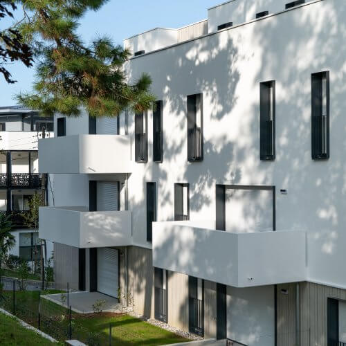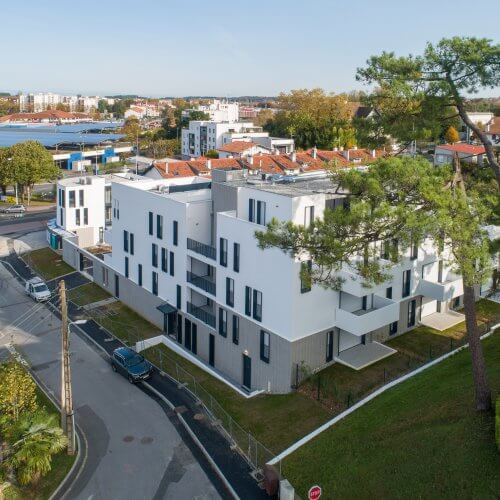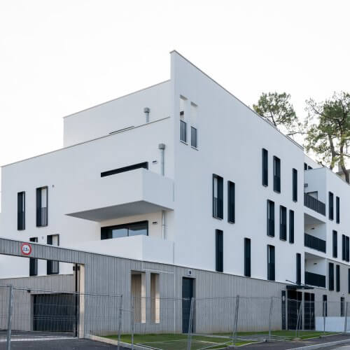 Cette façade protège des nuisances une architecture plus ouverte, faite de terrasses en escalier qui s’ouvrent à l’arrière du bâtiment vers le cœur d’ilot et le paysage plus verdoyant du quartier résidentiel de Beyris. Cette architecture tend à créer des ilots de calme et de verdure dans un environnent urbain dense et bruyant.