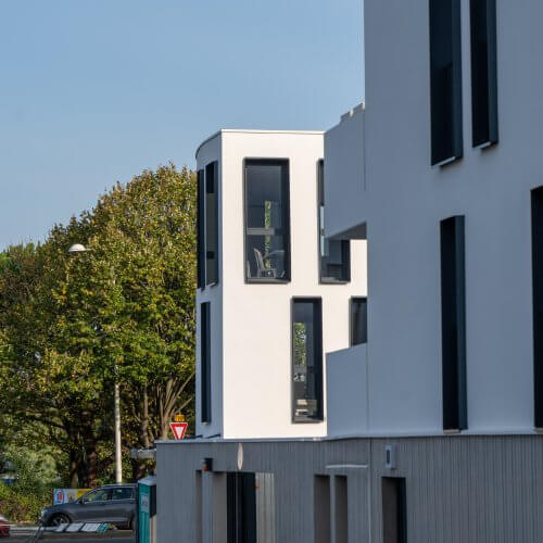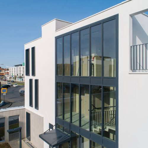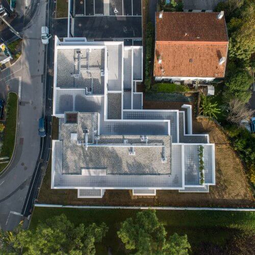 Le projet est composé d’un bâtiment de bureaux et commerces bordant la route, et d’un bâtiment d’habitations situé en retrait afin de bénéficier d’un environnement plus calme.  Les deux volumes blancs sont reliés par un socle en béton matricé qui assure une liaison esthétique et fonctionnelle entre les deux bâtiments. La façade sur rue, massive et minérale est tramée de fines ouvertures en acier noir, elle répond à l’atmosphère urbaine et bruyante la zone commerciale.