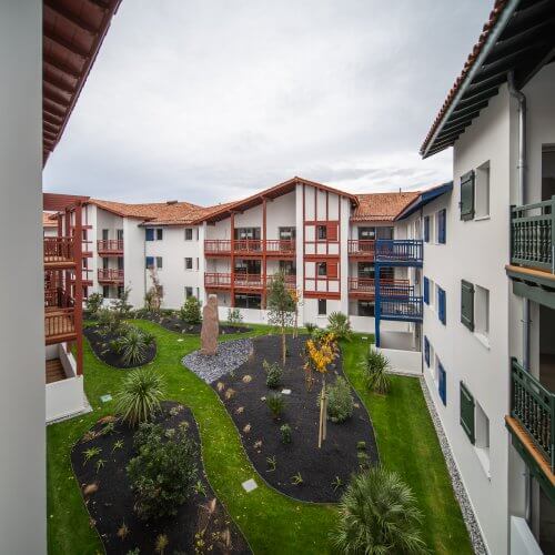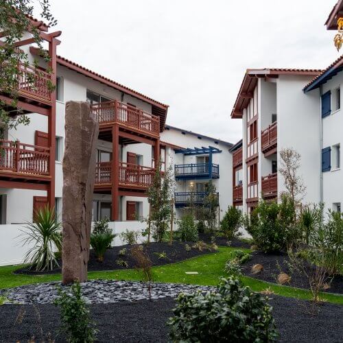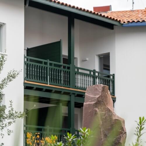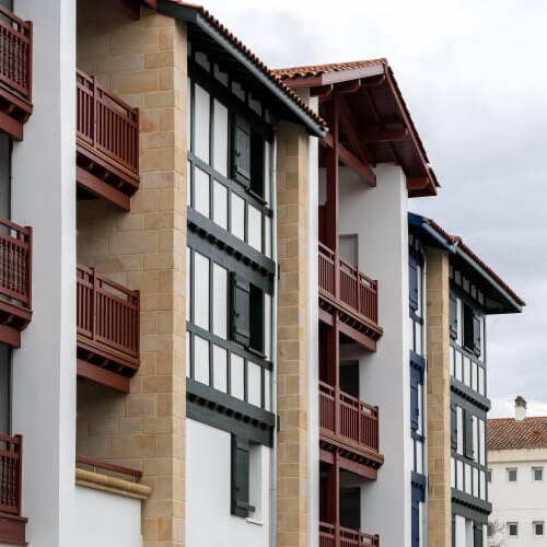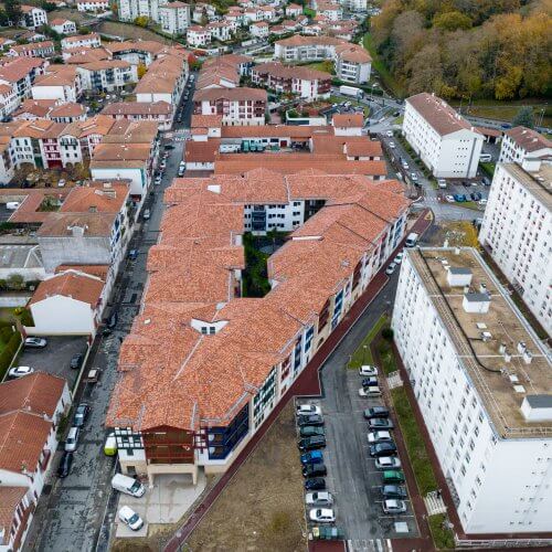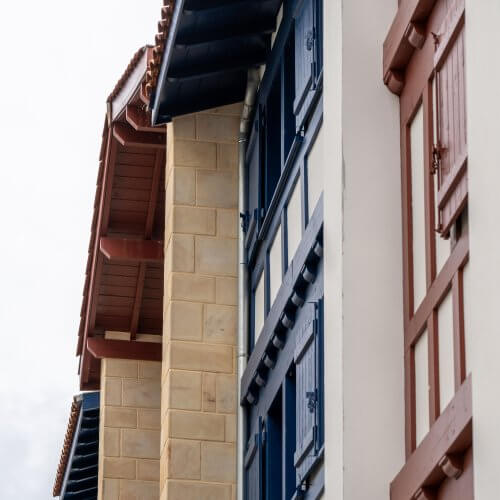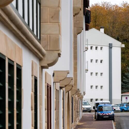 Le vocabulaire architectural choisi est d’inspiration néobasque, reflétant l’esprit des opérations récentes alentours. Ainsi, façades blanches, tuiles romanes et socles habillés de pierre beige mettent en lumière les boiseries et divers bardages alternant le rouge, le vert et le bleu typiques des maisons basques. Le parti pris est appuyé par un jeu de toitures complexe, alternant croupes et pignons pour augmenter la diversité visuelle des diverses façades.