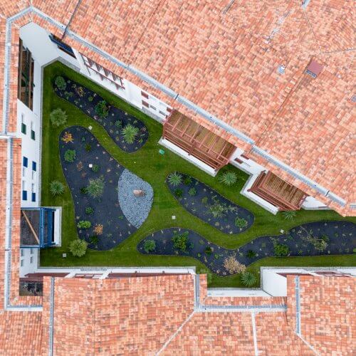 Le projet Santiago s’intègre dans un environnement résidentiel composé d’ensembles collectifs et de maisons de ville accolées. La résidence s’articule autour d’un vaste patio central planté d’arbres adultes qui recouvre le parc de stationnement.