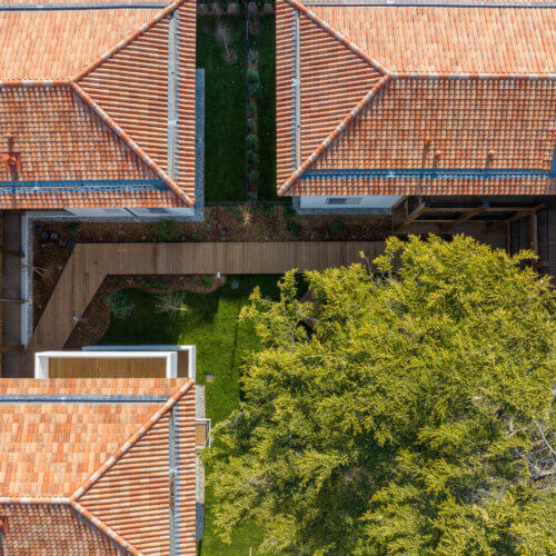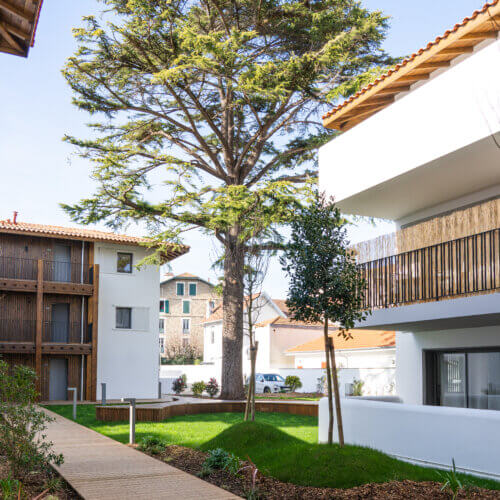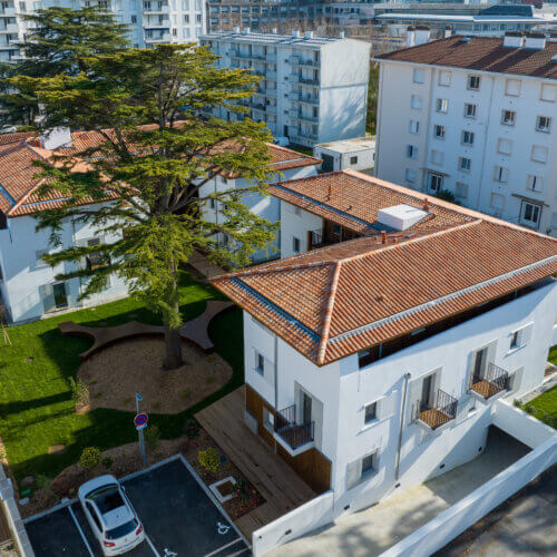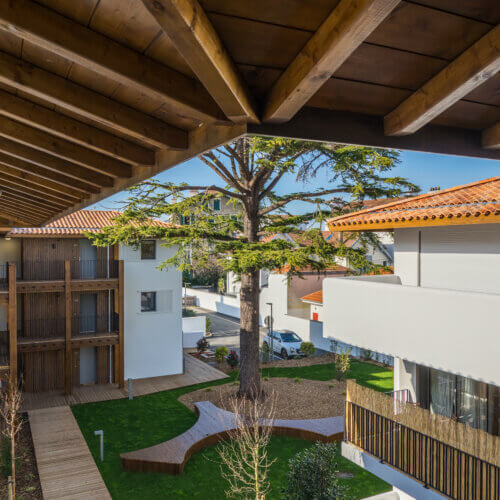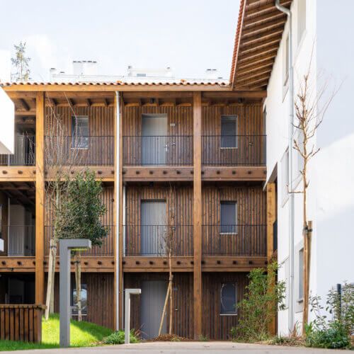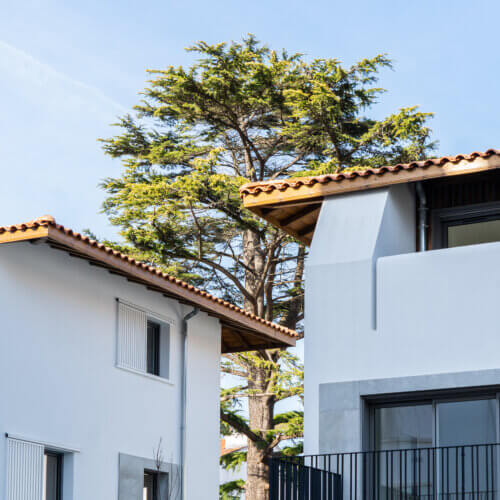 Ses lignes épurées et ses murs enduits de blanc contrastent élégamment avec les encadrements et balcons couleur pierre, les garde-corps en métal noir, les menuiseries en aluminium gris, les tuiles romanes plus classiques et les nombreux pans de lasures en bois ornant les façades, qui font écho aux cheminements extérieurs.